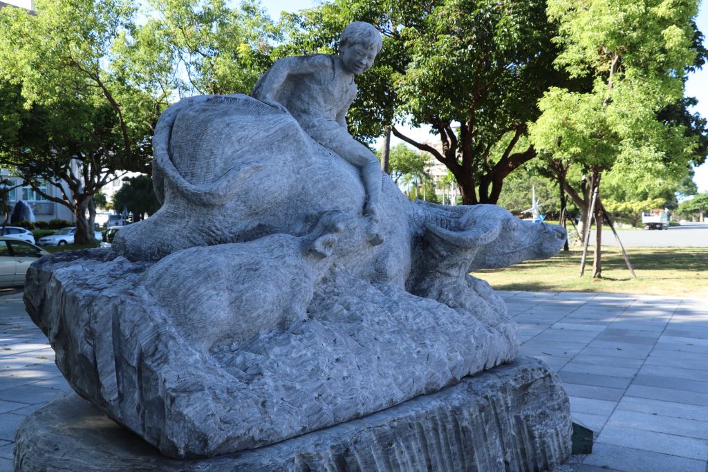 牧童坐在黃牛的背上,腳邊還有一隻小犢在撒嬌,放在綠意盎然的的公園之中,不僅和身邊場域對話,也能悠閒獨坐於綠蔭下,自成一個充滿田園野趣的休閒世界。作品的動機在追憶青少年的時期,農村裡充滿動力的生活,孩童放牧牛隻情景,耕牛伴隨人類數千年來都是默默耕耘。如今,時代轉變,工業機械取代動物勞力,這種優慢的鄉野情趣已不復見,為保留耕牛相伴的時代,深深刻記這份情感記憶。