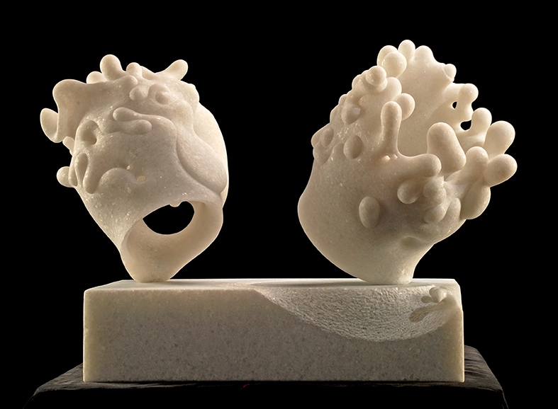 The artist thinks that “creation is not an operation but a presentation of inner mind.” His idea of creation is really reflected in the work “Carved Time” and most of his works of minimalistic concept. This work uses straight while lines which contains expressionistic style. Though the stone texture is quite hard, the soft curves and the buds grown out of vegetation-like area have covered the two masses and there are objects attached to it, as if all of them are living creatures and depicting the re-explanation of life in the artist’s heart. The two huge and hollow marble barrel-like masses are contacted with the pedestal by a small area which makes the work like clowns entertaining viewers with dancing.