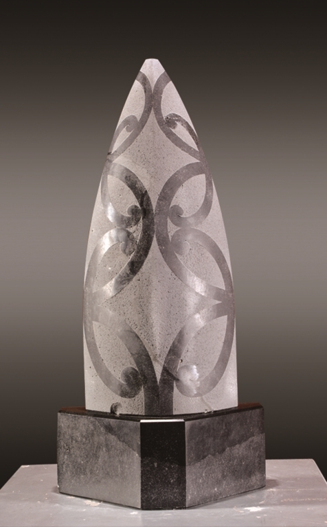 Nigel Scanlon is an artist/ designer/ sculptor with an incredible aesthetic sensibility. He has a natural ability to translate Maori iconography, not just from carved forms but also from raranga & tukutuku forms as seen here with his Waka tiwai, into successful & astoundingly beautiful contemporary sculptural forms. An uri of Whanganui, he is based mainly around Auckland, Waiheke & Raglan. Nigel is a regular at stone symposiums around Aotearoa and recently came back to Whanganui for Te Kahuitanga stone symposium on the Whanganui River bank, organised by long time friend & fellow sculptor/ artist, Aaron Te Rangiao. The symposium was run in conjunction with Whanganui Open Artists studios- organiser, Jo Ockey.