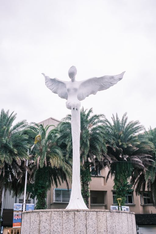 「天使之翼-大地女神」青銅雕塑作品由兩尊優雅翩然降落的大地女神-母親與女兒組成,她們低垂的雙眸深情地凝視大地,寬大的翅膀擁抱鄉親,矗立本縣重要地標,更是吳靜茹女士以實際行動回饋花蓮的藝術巨作。