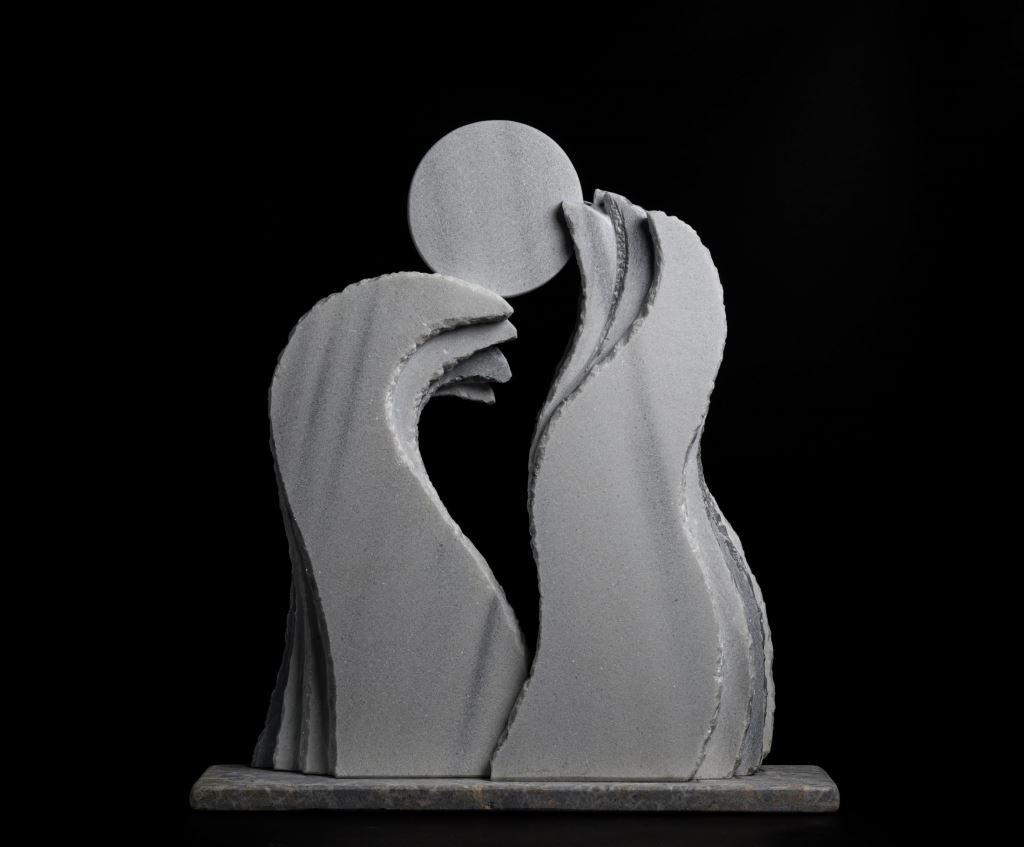 這件作品以堅硬的自然材料(石材)呈現大自然中詩意的景象。 如同台灣的地理環境,由山脈組成,四面環海。山脈不斷延伸如海浪,海浪的形象又似綿延的山脈,交替變化親吻著月亮。 一夜又一夜,皎潔的圓月面對海洋,獻出它銀色的光。這樣的美景將永恆成為藝術家的創作靈感泉源。