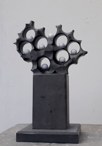 雕塑讓人聯想到一棵樹,在空的黑色圓圈中,白色球形成對比。 它們代表著長期愁熟的果實。它們藏著種子,象徵著希望。