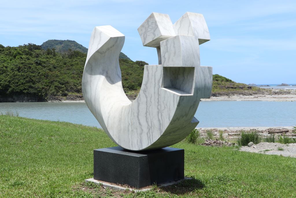 作者探討戶外雕塑介入自然空間的關係, 此作品構想來自於書法中揮灑的飛白效果, 猶如石雕技法中的虛與實、動與靜, 正好呼應此次花蓮國際石雕藝術季徵件主題石動曼波。