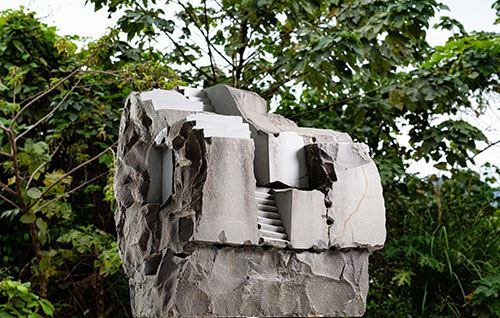 以中國藝術常用的一種手法─利用原生或自然力量形成的造型「天趣」或「天機」,再因材施雕而成之雕塑作品,例如漢代霍去病墓石雕。 這件作品「山水」,作者利用玄武岩岩石,以上述手法雕刻出梯狀和平面幾何造型,與石材自然肌理二者之間的互相對比關係,用以觸發觀者內心的共鳴,而體現天人合一的思想、人文精神與情感之交流。這件作品以一種抽象和寫意之風格表現山水之美,讓觀者如臨山野溪流之中。