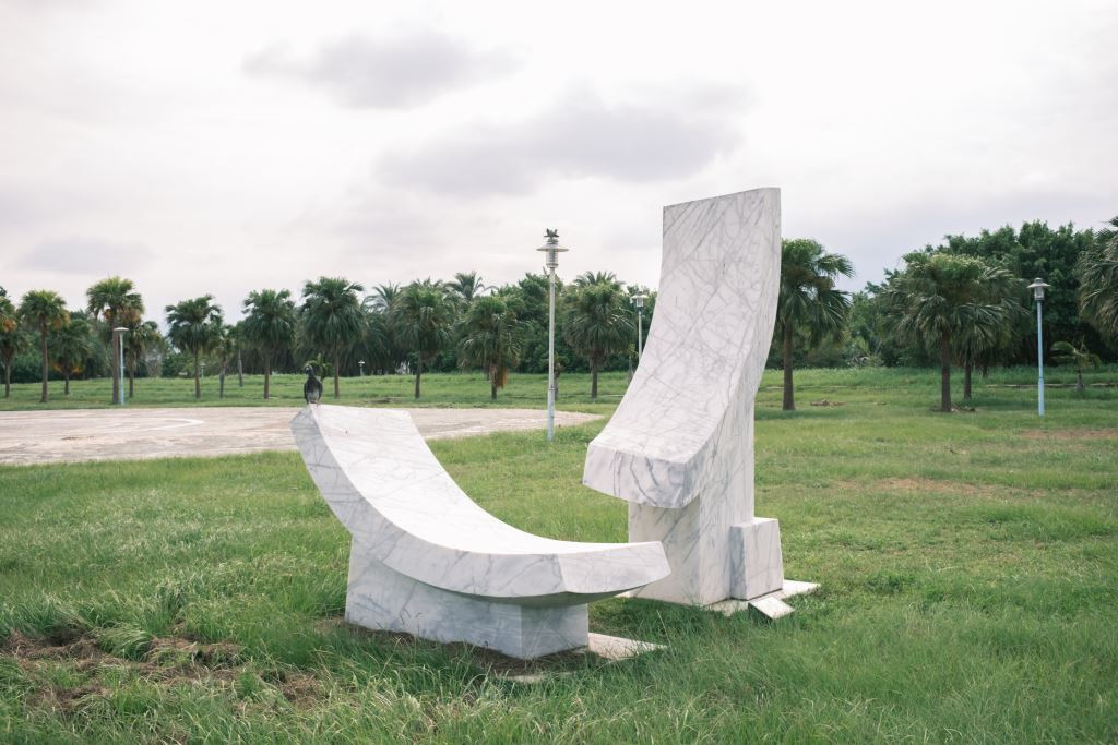 主題「月光」是以白色大理石雕刻出兩件組合的作品,呈現兩片大弧形,彎曲展延的造型,意圖表現時間和空間的距離。