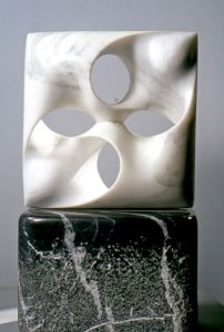 作者以鏡射的圖案手法,將石材設計成視覺性對稱感覺,琢磨出柔軟而多變化的線條,相互對應的扭轉平面極富對稱性,往往讓人以為是採取數學方法來計算作品的線條,鏤空的四個洞是上下與左右對稱構成,如鏡子般魔幻倒映,也像時間的計時器沙漏的外形,只有象徵時間的沙向下流動。 作品透露了時空的內在與外在,可見與不可見,現在與未來的因果關係,讓觀者能對無形的時間與有形的空間作出聯想力的想像。