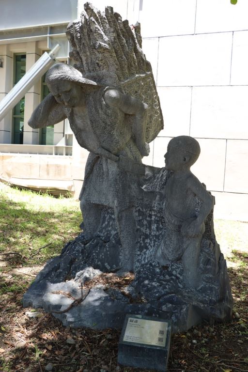 作者擅長以原住民為主題,融入德魯固原住民族生活中,刻畫獵人面對生活的毅力。 獵人除了入山打獵外,還有許多為籌生活的粗活需要準備。此作品的健壯男子背著滿簍材薪,負重載歸的滿足;身旁的幼子追隨,有一種薪傳見習的家教。雖然山路顛簸難行,生活於斯卻甘之如飴。作品表現父子親情融於山林,認真生活深入土地,簡單的謀生工具就能世代綿延。作者將獵人家族投射在石頭粗獷的肌理中,感受到的他們堅毅不拔的精神。