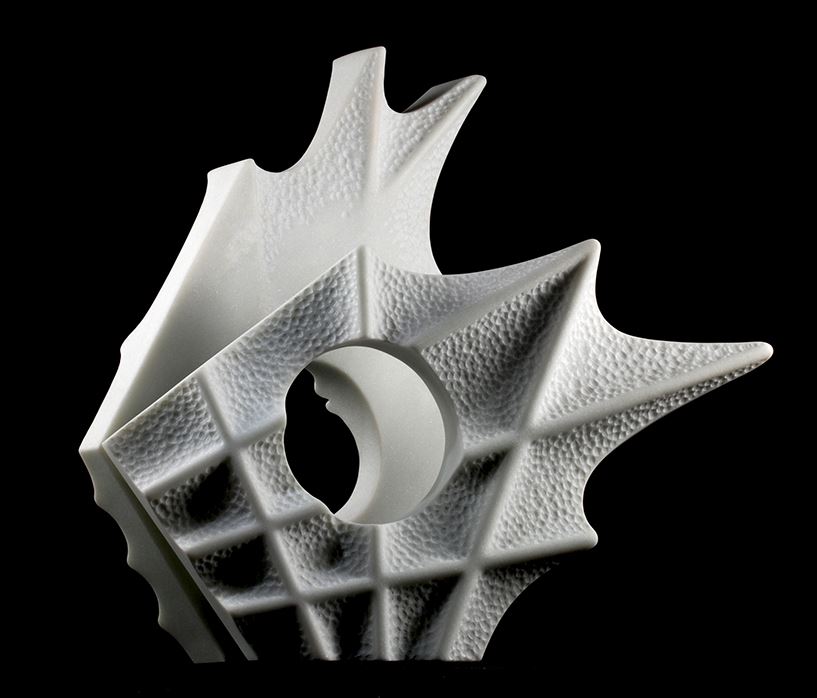 作者以兩片豎立的白大理石片,平面化半具象的表現蝴蝶的雙翅。透過昆蟲羽化成蝴蝶的概念,表現心靈對生命蛻變的觸動。