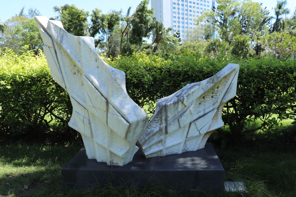 作者將浪花簡化為放射狀的片狀格紋造形,簡潔俐落的線條,呈現出海岸舞動的浪花景象。作品以純白色大理石的質地,表現水花泡沫光影的色澤樣貌,增添浪花的潔淨美感,並連結了簡單的概念,造形變得親近易懂。二大片斜紋格的白大理石,像似由遠而近的海浪透視,浪花與水珠呈現交織的美感,轉化成象徵蝴蝶般的翅膀,在陽光遍灑照射下,脈絡肌理半透光的反射出海岸線的曲折,是花蓮的太平洋左岸特徵。