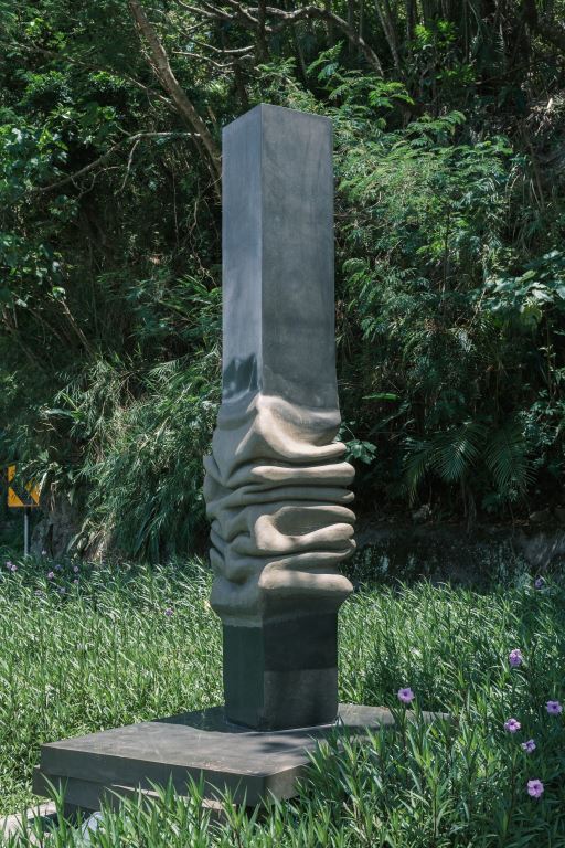 黑色的直立石柱,其上下兩端的光滑表面與中間灰色未磨光的皺摺形成明顯對比,彷彿正承受著巨大壓力,靈感來自921大地震一處倒塌的廢墟中發現的變形壓縮鋁罐。此件作品可由兩個層面觀看:在表現上,特別採用質地堅硬的黑色花崗岩雕塑出遭受強大壓力的形態,以製造反差的效果與玩味石頭的可塑性;在寓意上,將受擠壓的石柱比作人生–每個人都必須面對各自的困境與考驗,而這件作品即為生命的真實縮影。