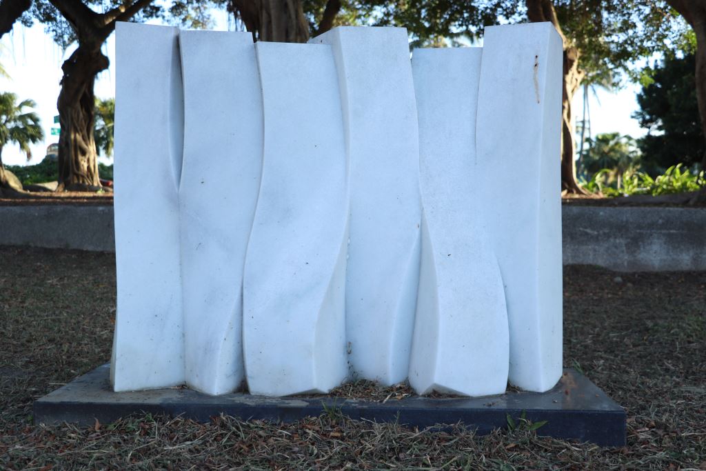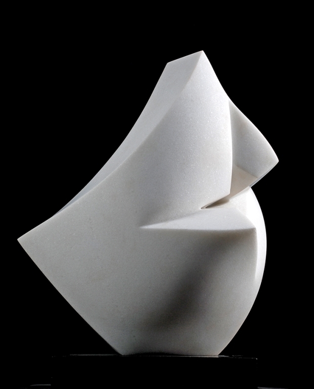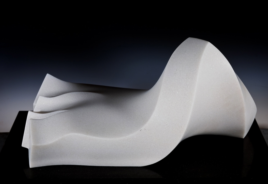 在《飛舞展翅》這件作品中,向光華將塊狀量體翻摺成一個動感的多面體,作品命名不只形容蝴蝶輕盈慢舞的飄擺姿態,在石雕的陰刻、陽刻之間,也以豐富的空間感表現出蝴蝶成蛹到脫蛹的過程,塊面融合間展示了生命的動態。《三月飛白》呈現環狀的瀠洄量體,透露出白蝶嬉戲與飄舞於林間的生命動態,方圓之間的呼應、量體連接的循環,喚醒恬靜優雅的生命記憶,更象徵了一種百花盛開的永恆自然。向光華除了思考石雕造型的表現,也考慮到光與作品之間的關係,
