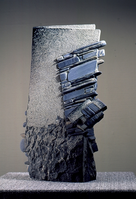 的技術,則是將璞石畫帶入新的藝術里程碑。「背膠解裂法」是將石材背膠裁切成薄片,以塊狀進行創作運用,讓石材任由創作者依其創作形態裁切,石材敲碎的技法也依創作者的力道、落點呈現不同的視覺效果,打破過去石材規格限制,讓璞石畫從工藝技法走向藝術創作,邱創用說:「璞石藝術的靈魂,沒有背膠解裂的技術,我們就沒辦法脫離傳統馬賽克式的工法」。2005 年花蓮國際石雕藝術季時,當時的中央研究院院長參觀展覽時,對於璞石畫這樣的表現形式感到興趣,便邀請邱創用於中央研究院放置一件作品。思索中央研究院的創辦精神與宗旨,邱創用創作了作品──《躍昇》,作品右側以書卷、甲骨文的意象象徵「人文」;以電子原子元素象徵「科技」,透過線條錯落產生動態視覺,把視線從右帶至左側穹蒼,象徵著人文與科技將文明帶入宇宙之際、展現無限未來,在這幅作品中可以看到他對於線條的嫻熟運用。邱創用直說線條是他喜歡使用的造型元素,在傳統石雕或璞石藝術中,都可表現強烈的速度感,透過線條的排列可讓作品更加生動。在漫長的創作歲月裡,邱創用對於石材的研發、技術提升從未間斷,不斷精益求精挑戰各種可能,2012 年成功研發重組石材