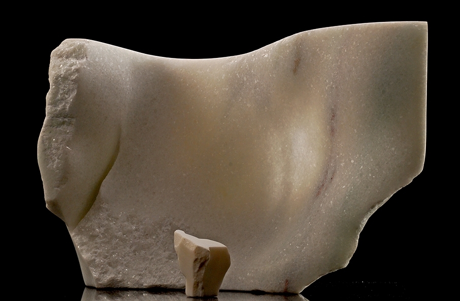 石材需要處理至輕薄,才有透光的可能,她說拋薄其實不難,難的是石材經不經得起雕磨時的震動,所以她選擇如越南白色大理石這類經得起雕刻的石材來創作,也需要耐心,例如用鐵鎚大敲會崩裂,只能一層一層地刮,實屬「很麻煩的技巧」。在《峽谷微風起》這件作品中,正面可清楚看見曲線線條勾勒出的視覺動態及晶透感,保留石材紋路,從側面欣賞則會見到白色大理石如同成薄片般透光,走進看更會驚艷於層層之間近距離空間工法的挑戰問起她的創作理念,