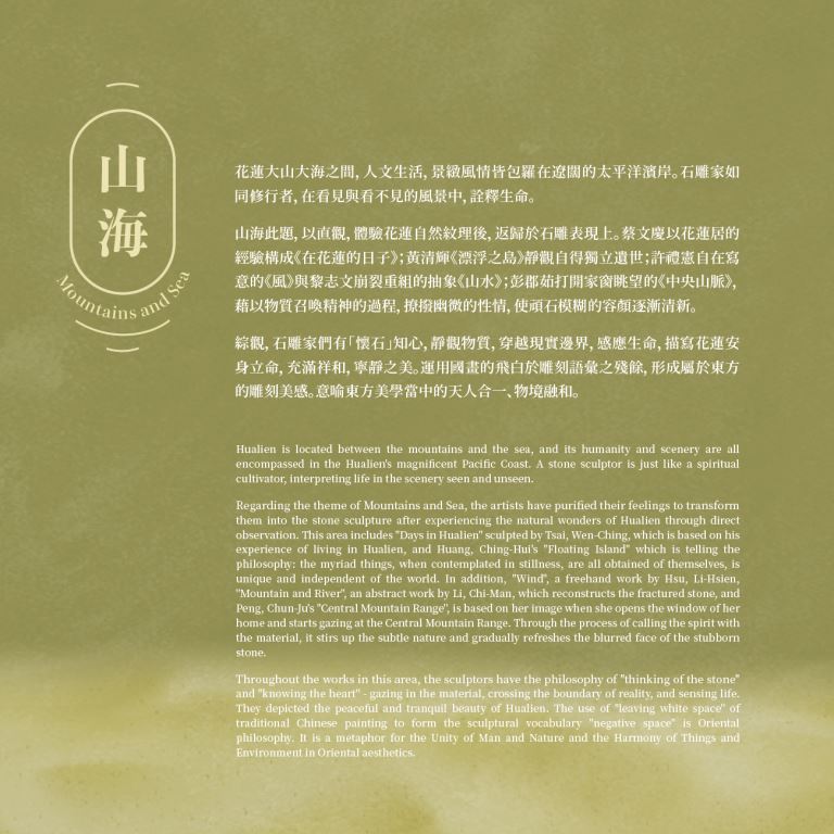 山海此題,以直觀,體驗花蓮自然紋理後,返歸於石雕表現上。蔡文慶以花蓮居的經驗構成《在花蓮的日子》;黃清輝《漂浮之島》靜觀自得獨立遺世;許禮憲自在寫意的《風》與黎志文崩裂重組的抽象《山水》;彭郡茹打開家窗眺望的《中央山脈》,藉以物質召喚精神的過程,撩撥幽微的性情,使頑石模糊的容顏逐漸清新。