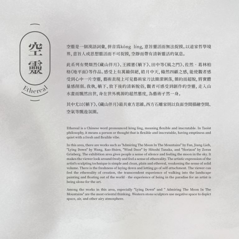 In this area, there are works such as "Admiring The Moon In The Mountains" by Fan, Jiung-Lieh, "Lying Down" by Wang, Kuo-Hsien, "Wind Door" by Hitoshi Tanaka, and "Horizon" by Zoran Grinberg. The exhibition area gives people a sense of silence and feeling the moon in the sky. It makes the viewer look around freely and feel a sense of ethereality. The artistic expression of the artist's sculpting technique is simple and clean, plain and ethereal, weakening the sense of solid volume. There is the freshness of laying down and letting go of self-attachment. The viewer can feel the ethereality of creation, the transcendent experience of walking into the landscape painting and floating out of the world - the experience of being in the paradise for an artist is being alone for the art.