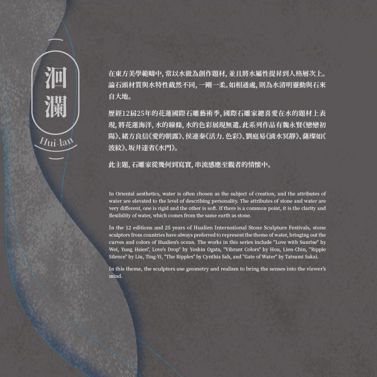 In the 12 editions and 25 years of Hualien International Stone Sculpture Festivals, stone sculptors from countries have always preferred to represent the theme of water, bringing out the curves and colors of Hualien's ocean. The works in this series include "Love with Sunrise" by Wei, Yung Hsien ", Love's Drop" by Yoshin Ogata, "Vibrant Color" by Hou, Lien-Chin, "Ripple Silence" by Liu, Ting-Yi, "The Ripples" by Cynthia Sah, and "Gate of Water" by Tatsumi Sakai.