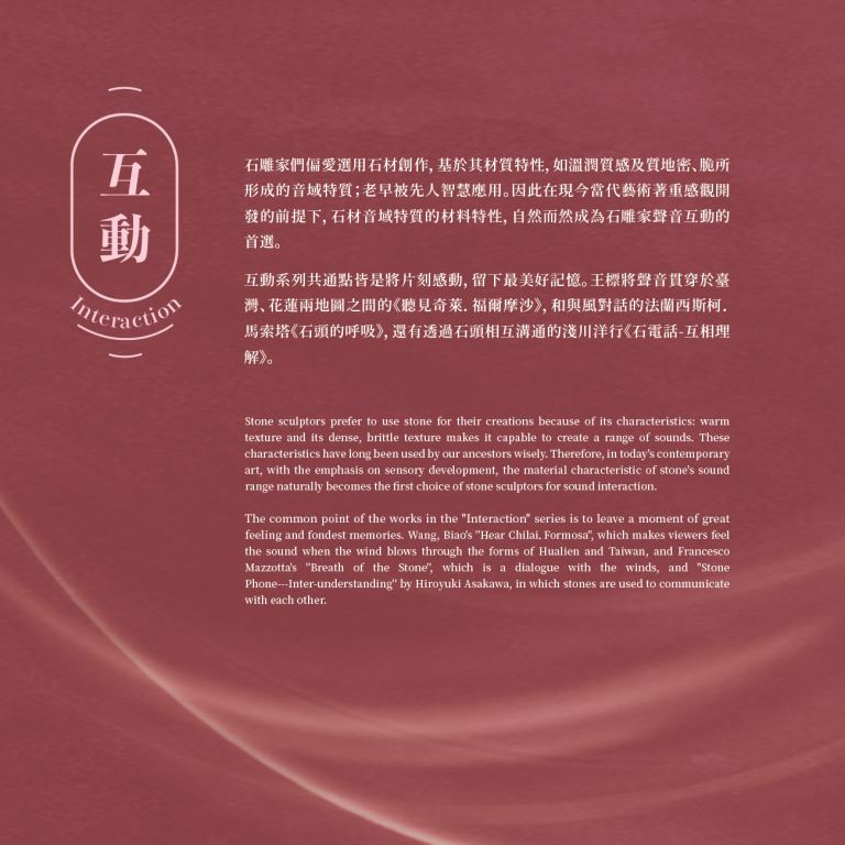 The common point of the works in the "Interaction" series is to leave a moment of great feeling and fondest memories. Wang, Biao's "Hear Chilai.Formosa", which makes viewers feel the sound when the wind blows through the forms of Hualien and Taiwan, and Francesco Mazzotta's "Breath of the Stone", which is a dialogue with the winds, and "Stone Phone---Inter-understanding" by Hiroyuki Asakawa, in which stones are used to communicate with each other.