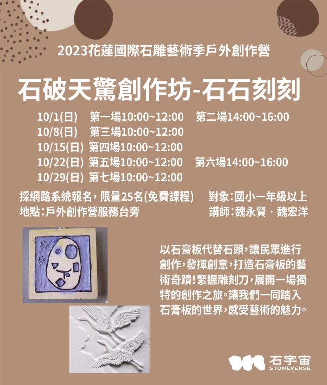 #2023花蓮國際石雕藝術季-石宇宙,為了讓來到花蓮的民眾可以更了解石雕藝術,在週末規劃了❸個主題X共❷⓿場的 #民眾共創活動,要讓喜愛石雕藝術的朋友親手體驗石雕藝術的獨有魅力,一起加入石宇宙的創作行列!