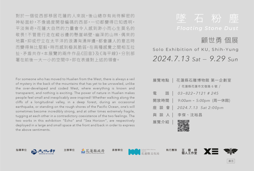 對處於後疫情時期,甫歷經大自然震驚的花蓮而言,確有需要藉由藝術進行轉化、療癒,再次開啟與自然美好的相遇。顧世勇透過「墜石粉塵」一展,將花蓮日常背後,所隱藏自然不可知力量的威脅,透過「石粉」此一物質的敏感特質,一方面擴張、延伸石雕的觀念,並隱喻無處不在的細微力量。另一方面,以藝術的形式邀請大家參與在作品其中,直面這份潛在的自然力量、與之共振。誠摯歡迎各界朋友共同參與這場藝術饗宴!