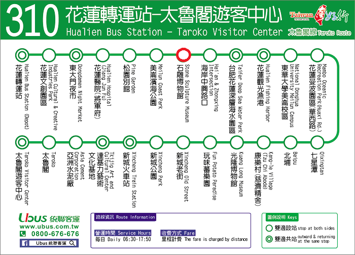 或請您於花蓮火車站前站出站後,前往 #花蓮轉運站 搭乘統聯【310太魯閣線】於「石雕博物館」站下車。