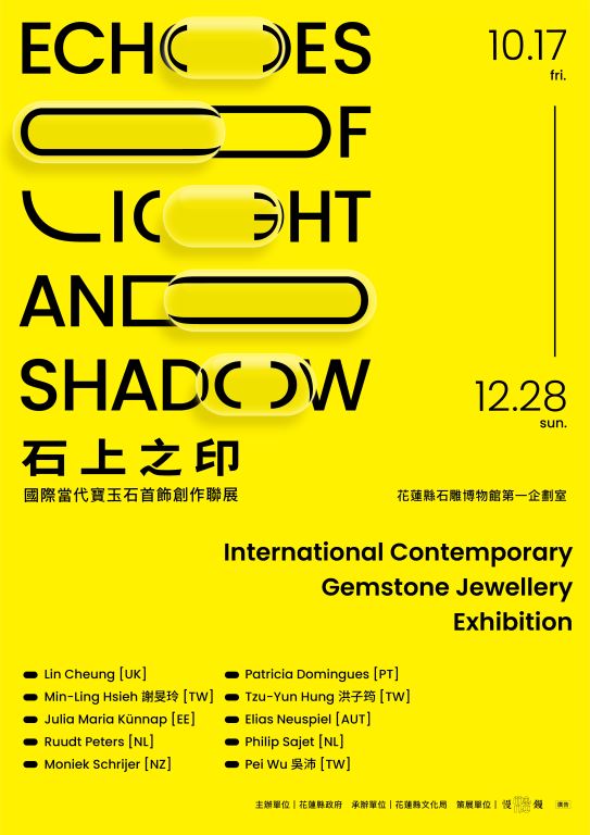 " Echoes of Light and Shadow: International Contemporary Gemstone Jewellery Exhibition," hosted by the Hualien County Government, organized by the Hualien County Cultural Affairs Bureau, and curated by Mano, will be on display in the First Planning Exhibition Area of the Hualien County Stone Sculpture Museum from October 17 to December 28, 2025. This this exhibition invites ten international contemporary jewellery artists from seven countries and across generations. Each uses their unique vocabulary, seeking new possibilities of dialogue with the world through stones—liberating thought and form within a contemporary context. More than 50 pieces will be on display.