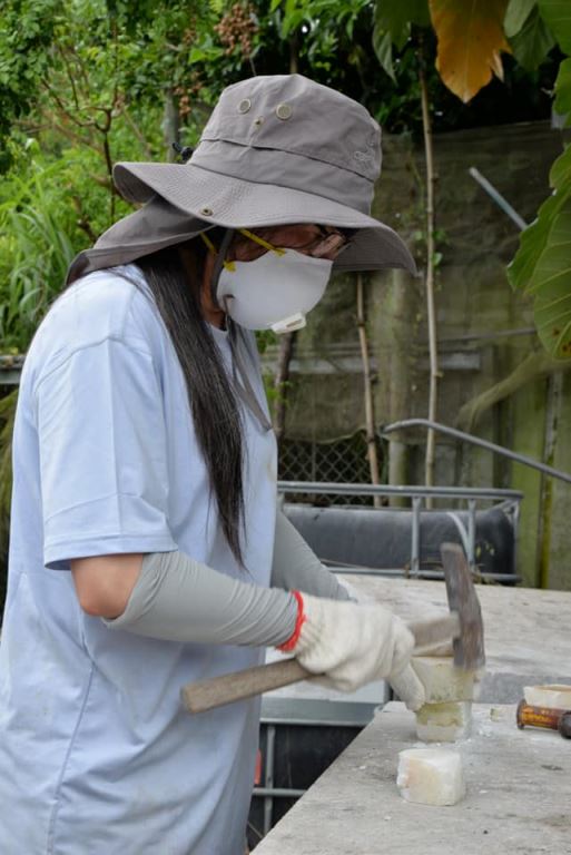 但小編內心充滿疑問,因此問了楊正端老師 : 老師啊…一塊石頭形狀完整,做啥把它崩一角啊~要示範何不去找其他不規則的石材,而且許禮憲老師也說 : 這花蓮白大理石紋路很美。(內心甚覺可惜~)