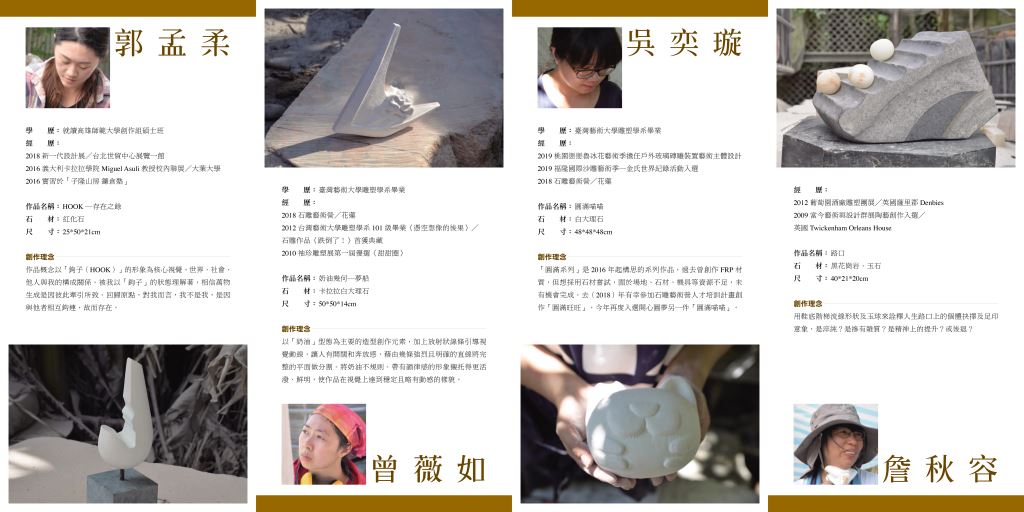 今年是花蓮石雕青培營的第四屆,整合型計畫的最後一年了,”解決石雕人才斷層”的問題是本局向文化部提案的初衷,很多計畫並非無中生有,都是咬著牙的一些信念而成,努力這些年來,也慢慢受到年輕一輩的重視,本次新成員中有台大商管系畢業的汪冠宇 (左)、高師美術所的郭孟柔 (右上)、南藝大的江郁航 (右中)、北藝大的黃亮俞 (右下)、英國自由創作家詹秋容(點一下+2),有新人就有新氣象,讓我們一起歡迎並期待他們的成果。