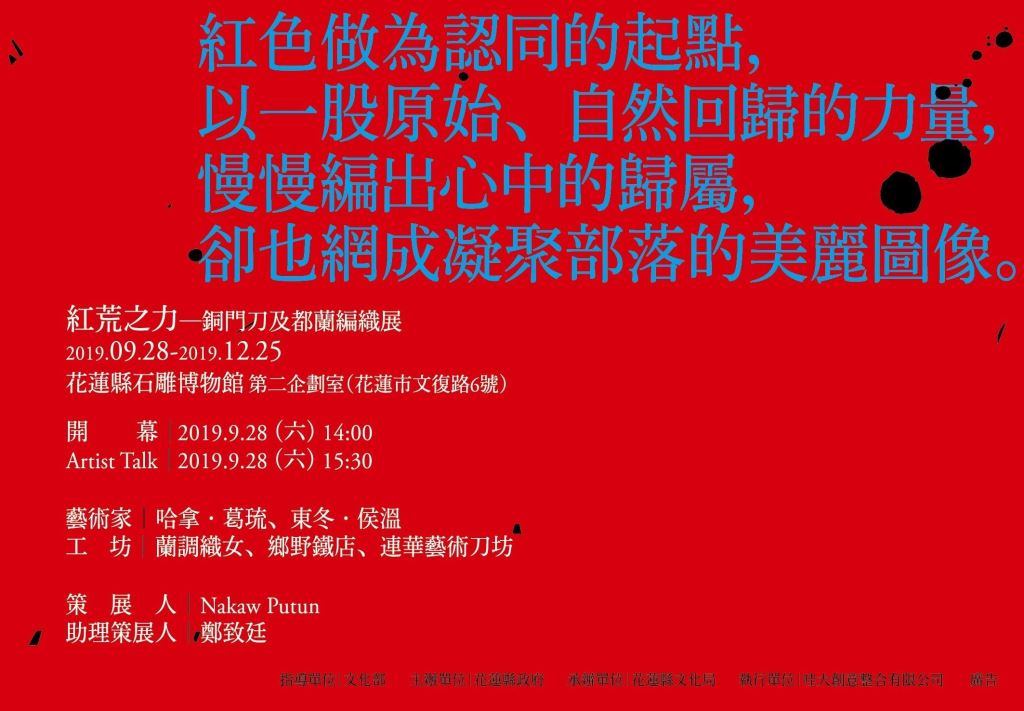藝術家以紅色做為認同的起點,並以一股原始、自然回歸的力量,慢慢編出心中的歸屬,卻也網成凝聚部落的美麗圖像。本展由花蓮知名策展人那高‧卜沌(Nakaw Putun)領軍策劃,共計展出裝置作品、手工編織生活用品、手工刀具等共計21件,勾織出部落藝術發展的真實面貌。歡迎鄉親踴躍於9月28日至12月25日至花蓮縣石雕博物館第二企劃室參觀,親自感受部落原始生猛的「紅荒之力」!